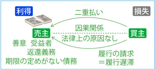 売買契約の買主が、勘違いによって代金を二重に支払ったとします。このように、法律上の原因がないのに、ある人(買主)の損失によって、別の人(売主。受益者)に利得が生じ、損失と利得の間に因果関係がある場合、その利得を不当利得といいます。受益者は、不当利得の返還義務を負います(民法703条)。