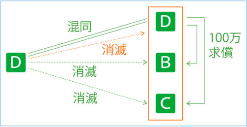 例えば、連帯債務者の1人であるAが死亡し、債権者Dが単独で相続したとしましょう。つまり、DとAに混同が起こったわけです。この場合、Aだけでなく、B・Cの連帯債務も消滅します。これが絶対効という意味です。