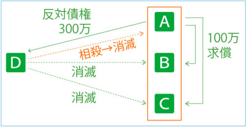 例えば、連帯債務者の1人であるAが債権者Dに対して300万円の債権(反対債権)を持っていたとしましょう。この反対債権を使って、AがDに対する連帯債務と相殺しました。これにより、Dの債権は消滅したわけです。この場合、Aだけでなく、B・Cの連帯債務も消滅します。これが絶対効という意味です。