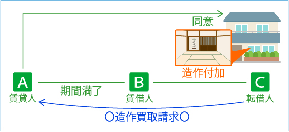 - CがBから甲建物を適法に賃貸された転借人で、期間満了によってAB間及びBC間の賃貸借契約が終了する場合、Aの同意を得て甲建物に付加した造作について、BはAに対する買取請求権を有するが、CはAに対する買取請求権を有しない。