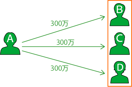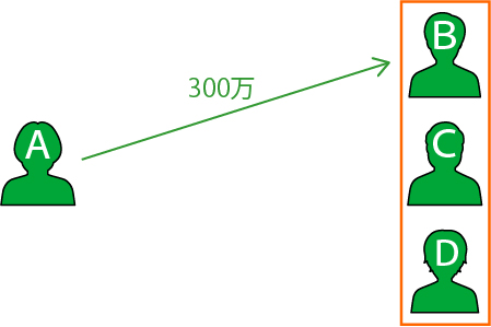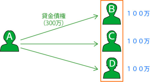 AがB・C・Dの3人に300万円を貸した場合、B・C・Dがそれぞれ100万円ずつ返済義務を負うのが原則です(分割債務)。