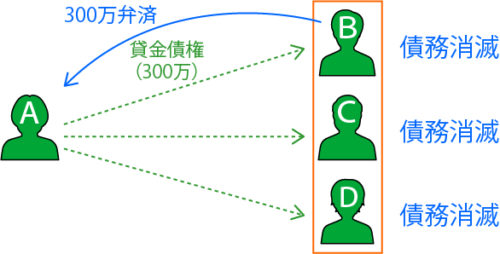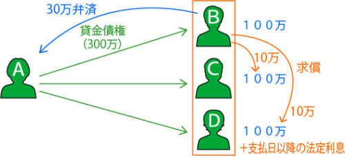 例えば、Bが100万円を返済したとしましょう。この場合でも、残り200万の返済について、C・Dだけでなく、Bも返済の義務を負います。このような債務を連帯債務と呼びます。