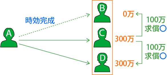 しかし、「連帯して返済する。」という特約をした場合には、話が違います。Aが合計300万円の返済を受けるまで、B・C・Dとも債務を負い続けるのです。