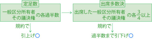 1R03-13-2形状又は効用の著しい変更を伴う共用部分の変更については、区分所有者及び議決権の各4分の3以上の多数による集会の決議で決するものであるが、規約でこの区分所有者の定数を過半数まで減ずることができる。