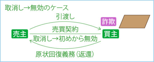 買主の詐欺により、売主が売買契約を締結し、この契約に基づいて売主が買主に土地を引渡しました。この後、売主が詐欺を理由に意思表示を取り消すと、契約は、始めから無効だったことになります(同法121条)。この場合にも、買主は原状回復義務を負います。つまり、この土地を売主に返還しなければなりません。