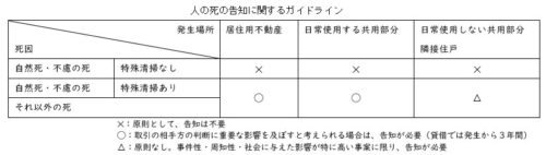 「居住用不動産」において、「自然死や日常生活の中での不慮の死」が発生していたとしても、特殊清掃や大規模リフォーム等が行われていない限り、取引の相手方に対して、これを告げる必要がありません(ガイドライン4(1)①)。