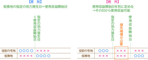 仮換地の使用収益開始日と仮換地の指定の効力発生日との間にズレがあり、それによって使用収益権者に損失が生じたと場合、施行者は、通常生ずべき損失を補償しなければなりません(同法101条1項)。