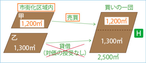 市街化区域内に所在する一団の土地である甲土地(面積1,200㎡)と乙土地(面積1,300㎡)について、甲土地については売買によって所有権を取得し、乙土地については対価の授受を伴わず賃借権の設定を受けたH
