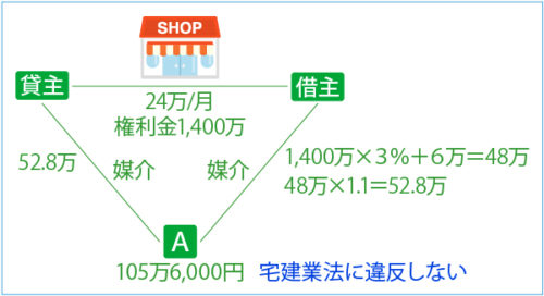 - ア Aが単独で貸主と借主の双方から店舗用建物の貸借の媒介の依頼を受け、1か月の借賃24万円(消費税等相当額を含まない。)、権利金1,400万円(権利設定の対価として支払われるもので、返還されないものをいい、消費税等相当額を含まない。)の賃貸借契約を成立させ、依頼者の双方からそれぞれ52万8,000円を報酬として受領したことは、宅地建物取引業法に違反する。
