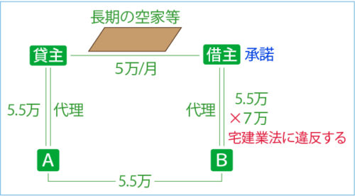 - イ 現に長期間にわたって居住の用、事業の用その他の用途に供されておらず、かつ将来にわたり居住の用、事業の用その他の用途に供される見込みがない宅地(1か月の借賃5万円。消費税等相当額を含まない。)について、Aは貸主から代理を依頼され、Bは借主から代理を依頼され、賃貸借契約が成立したので、Aは貸主から4万円を、Bは、代理の依頼を受けるに当たって、報酬が借賃の1.1か月分を超えることについて借主から承諾を得たうえで、借主から7万円を報酬として受領したことは、宅地建物取引業法に違反しない。