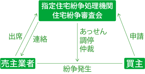 - 保険契約を締結している宅地建物取引業者及び当該業者が売主となっている新築住宅の買主は、指定住宅紛争処理機関に特別住宅紛争処理の申請をすることにより、当該新築住宅の売買契約に関する宅地建物取引業者と買主との間の紛争について、あっせん、調停又は仲裁を受けることができる。